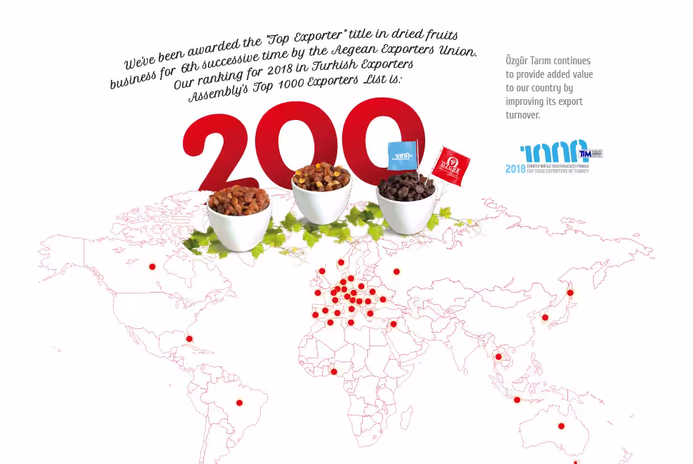 We have been producing in the fertile lands of Manisa since 1981, preserving the purest form of agriculture. We have gained a strong place in the global market with our products that comply with international quality standards, especially dried fruit and sultana grapes. We are investing in the future with our sustainable agricultural practices and modern facilities.